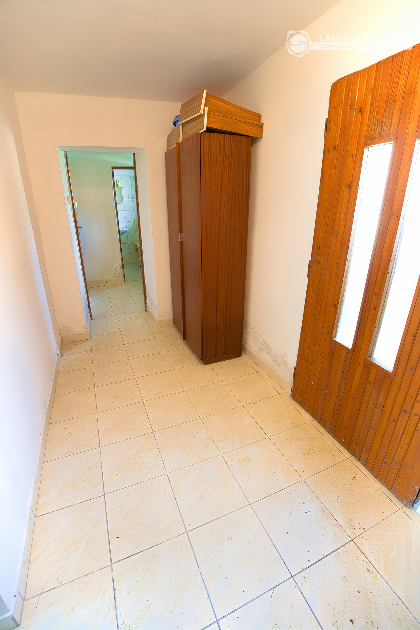 Pri vstupe do domu vás privíta praktická vstupná chodba, z ktorej je vpravo vstup do technickej miestnosti, samostatného WC a kúpeľne so sprchovacím kútom. Zo vstupnej chodby sa ďalej dostanete do kuchyne, z ktorej je prístup do obývačky (drevená časť domu), špajze a spálne.