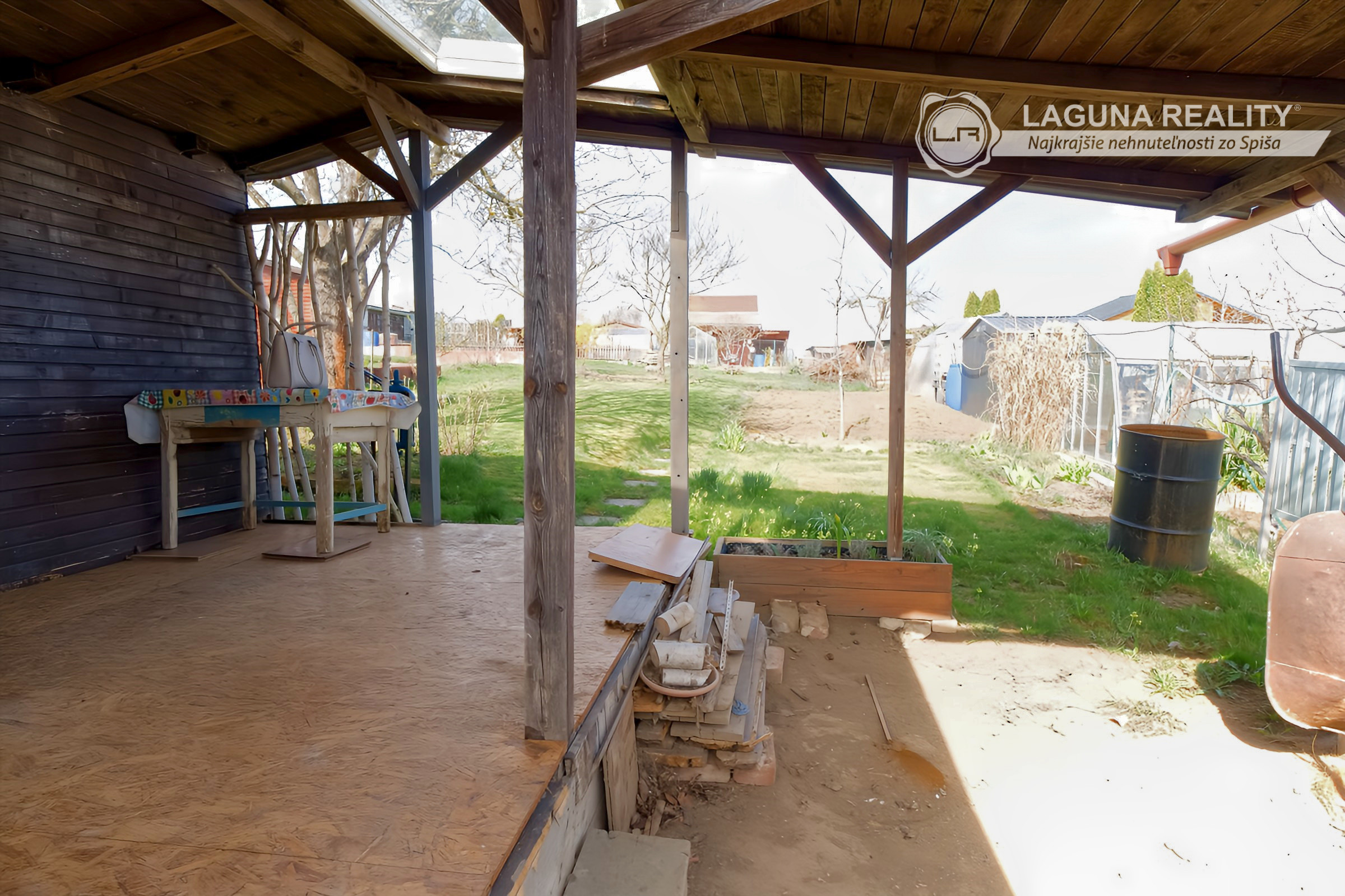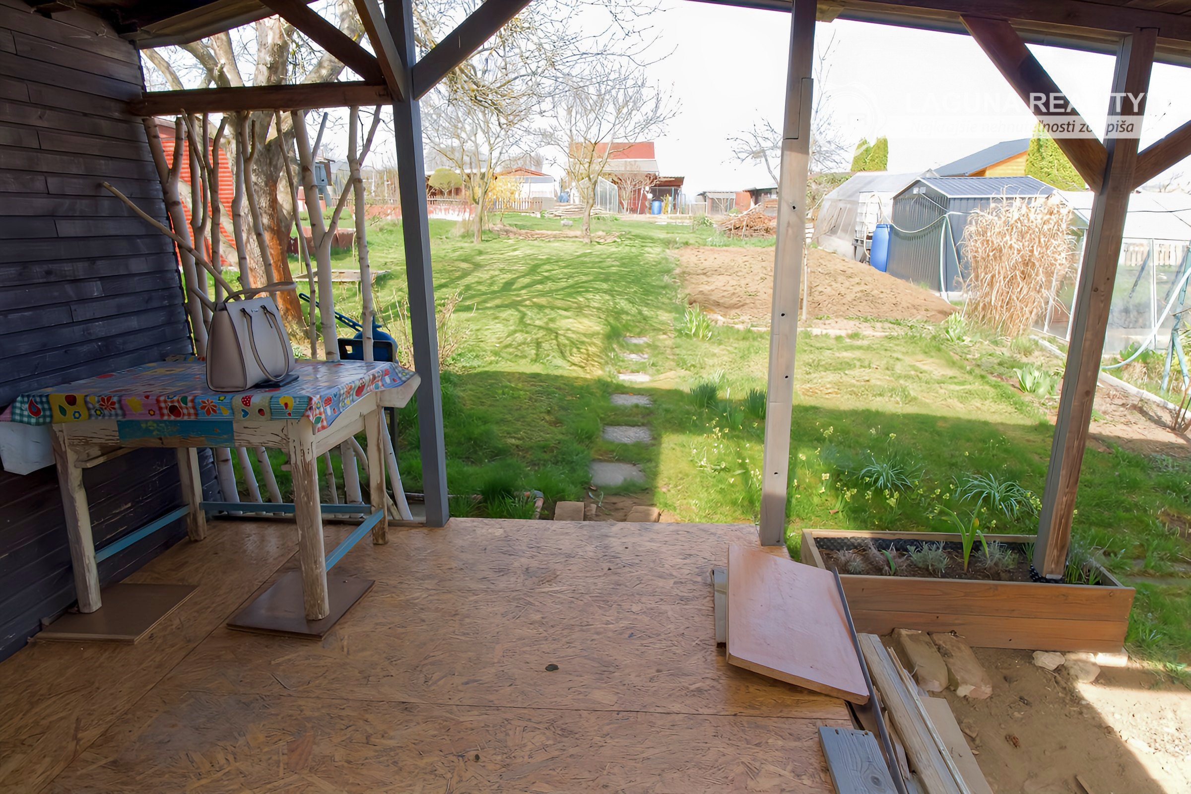 Súčasťou záhrady je aj drevená chatka vhodná na posedenie, či uskladňovanie záhradných potrieb a náradia, je čiastočne podpivničená. Na pozemku sa nachádzajú ovocné stromy, druhá polovica je využívaná na pestovanie plodín. Lokalita ponúka príjemné prostredie pre oddych a relax. K dispozícii ihneď.
