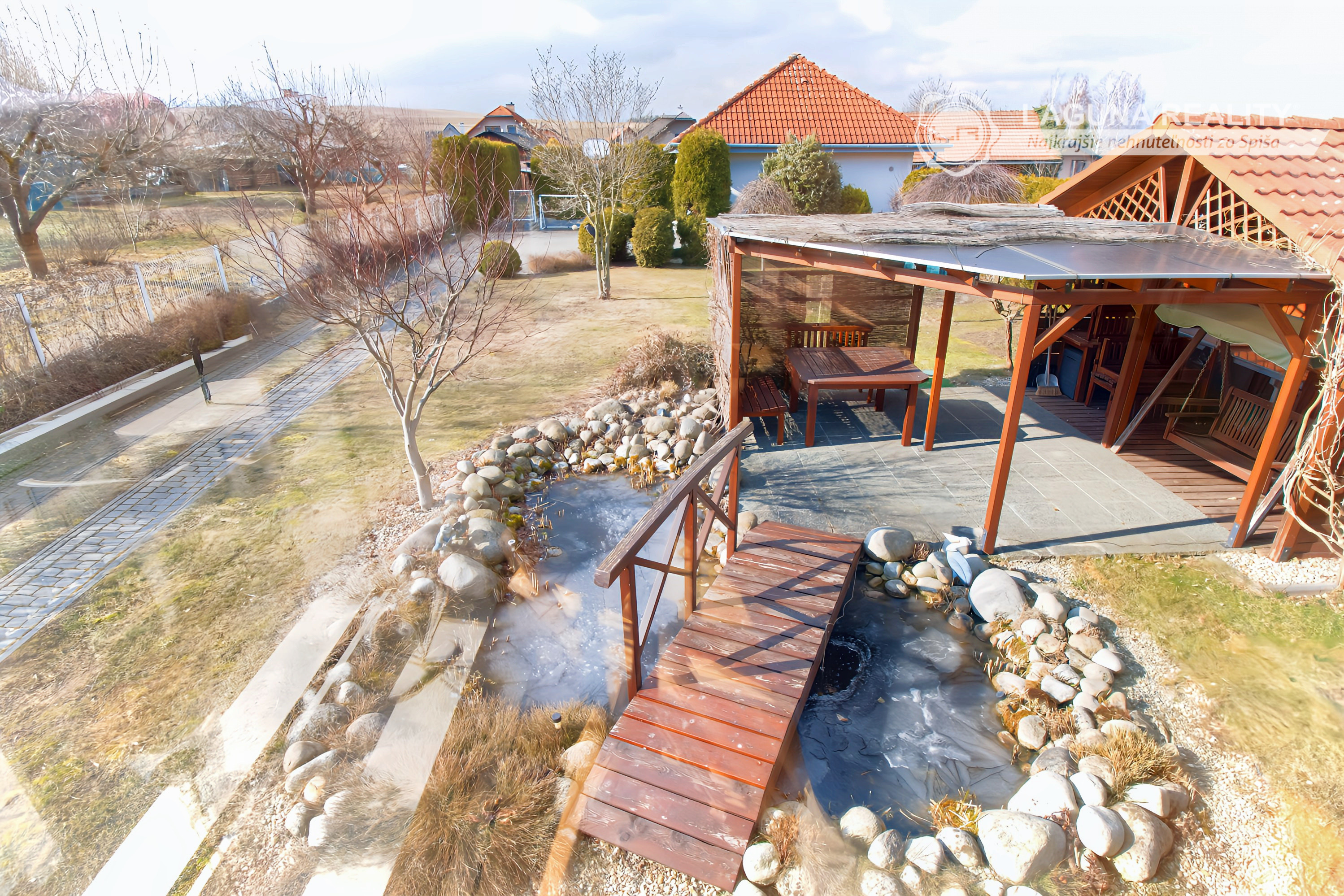 Veľkou prednosťou domu je VEĽMI PEKNE UPRAVENÝ A UDRŽIAVANÝ EXTERIÉR. Na celom pozemku je udržiavaný trávnik a osadené rôzne dreviny doplnené ďalšími prvkami záhradnej architektúry (chodníky, fontána, jazierko, lavička). VÝHODOU JE VONKAJŠIE ZASTREŠENÉ SEDENIE - ALTÁNOK s vonkajším krbom. V zadnej časti pozemku sa nachádza VELKÁ DVOJGARÁŽ so zastavanou plochou 48 m2.