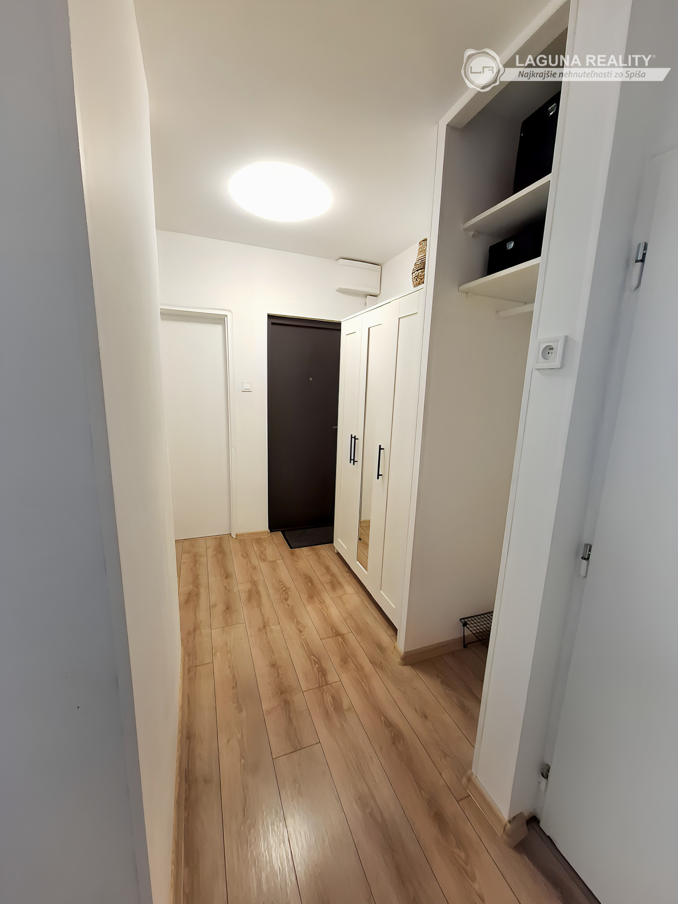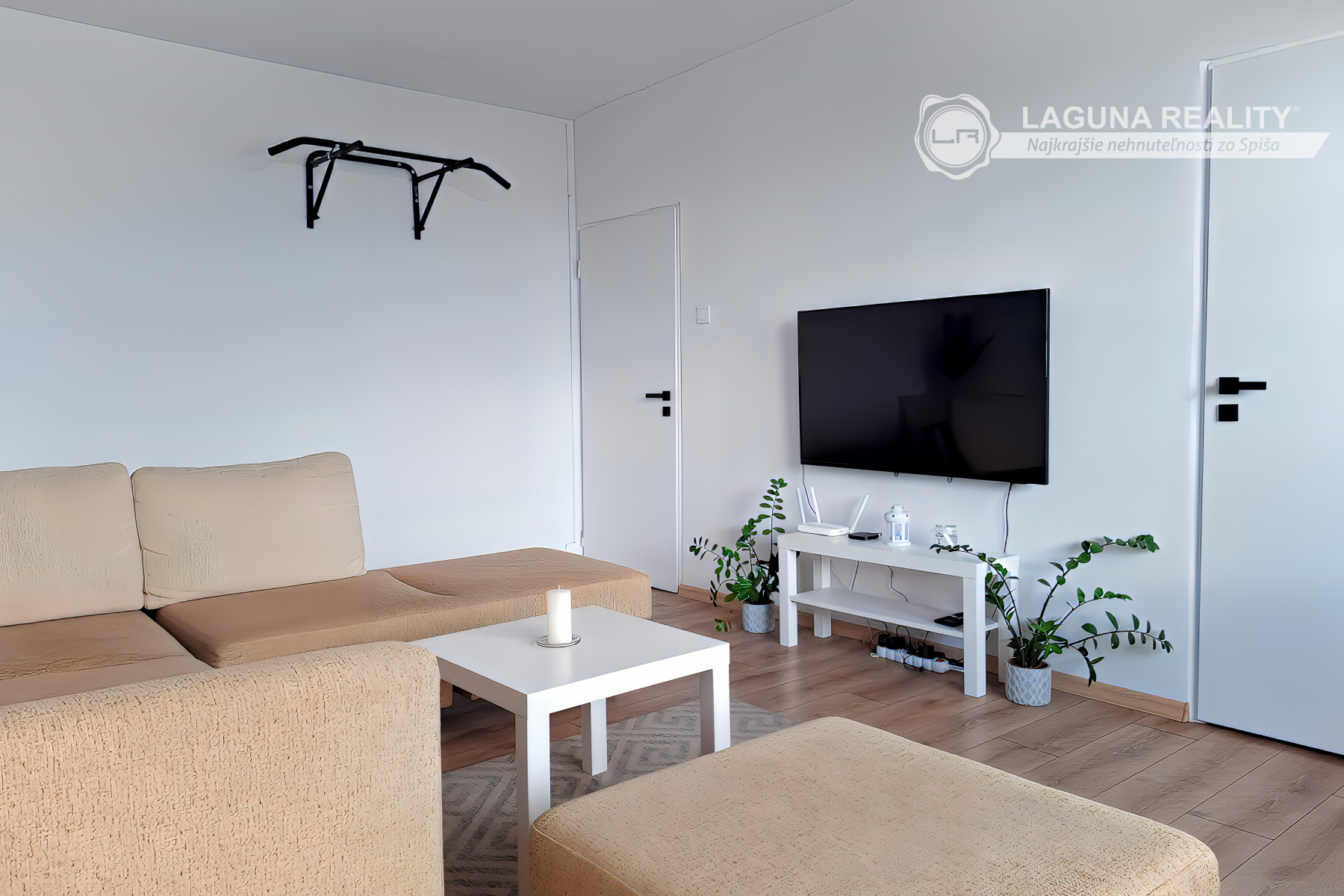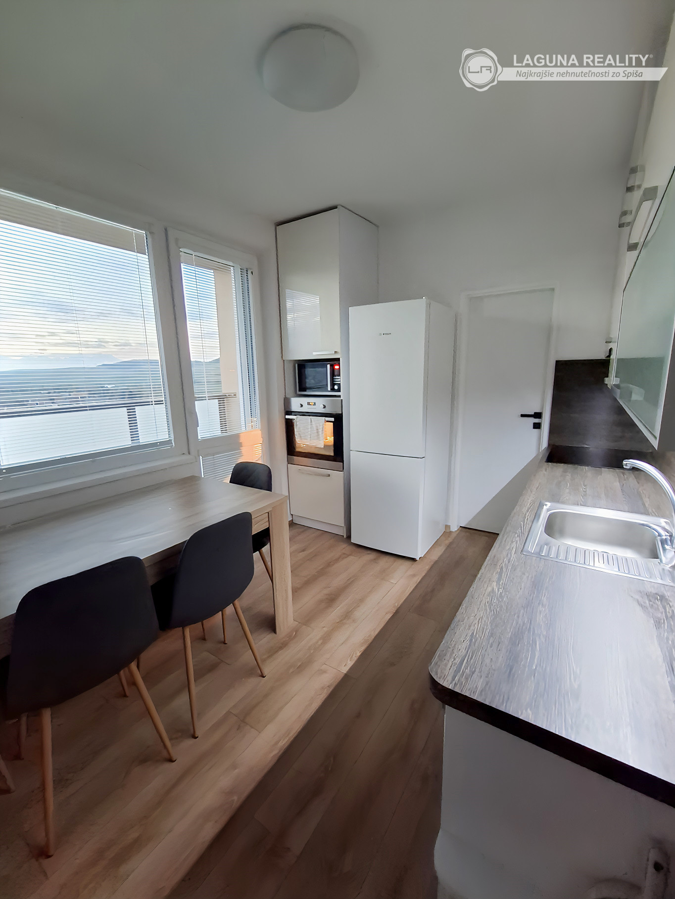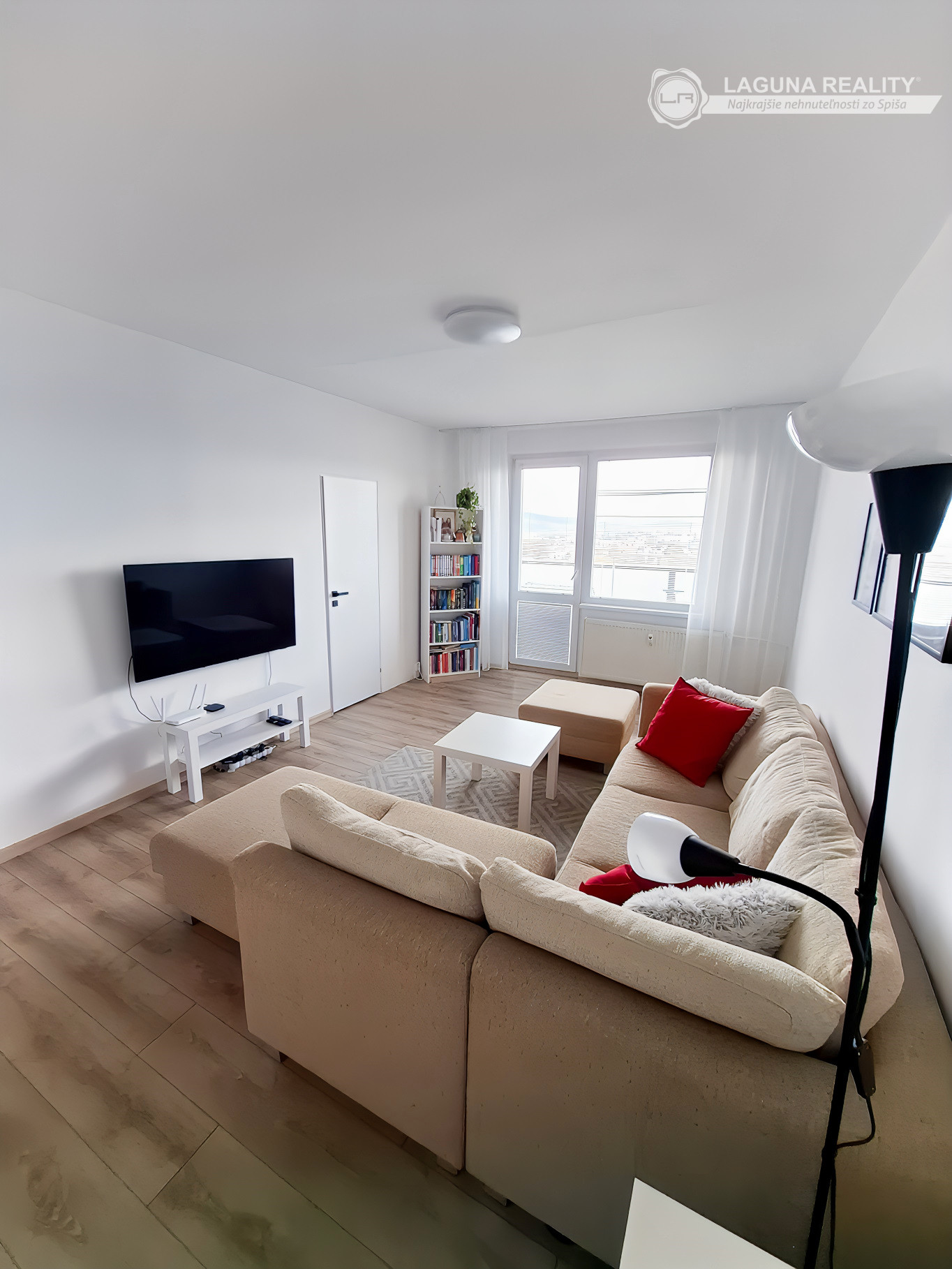 Pozostáva zo vstupnej chodby, troch izieb, kúpeľne a samostatného WC. Z obývacej miestnosti vedie výstup na balkónom s výhľadom na celé mesto Spišská Nová Ves a panorámu Vysokých Tatier a z kuchyne další balkón. Kuchyňa riešená na mieru je vybavená vstavanými spotrebičmi - indukčná varná doska, el. rúra, mikrovlnka, digestor, umývačka riadu, chladnička s mrazničkou. K bytu prislúcha pivnica.