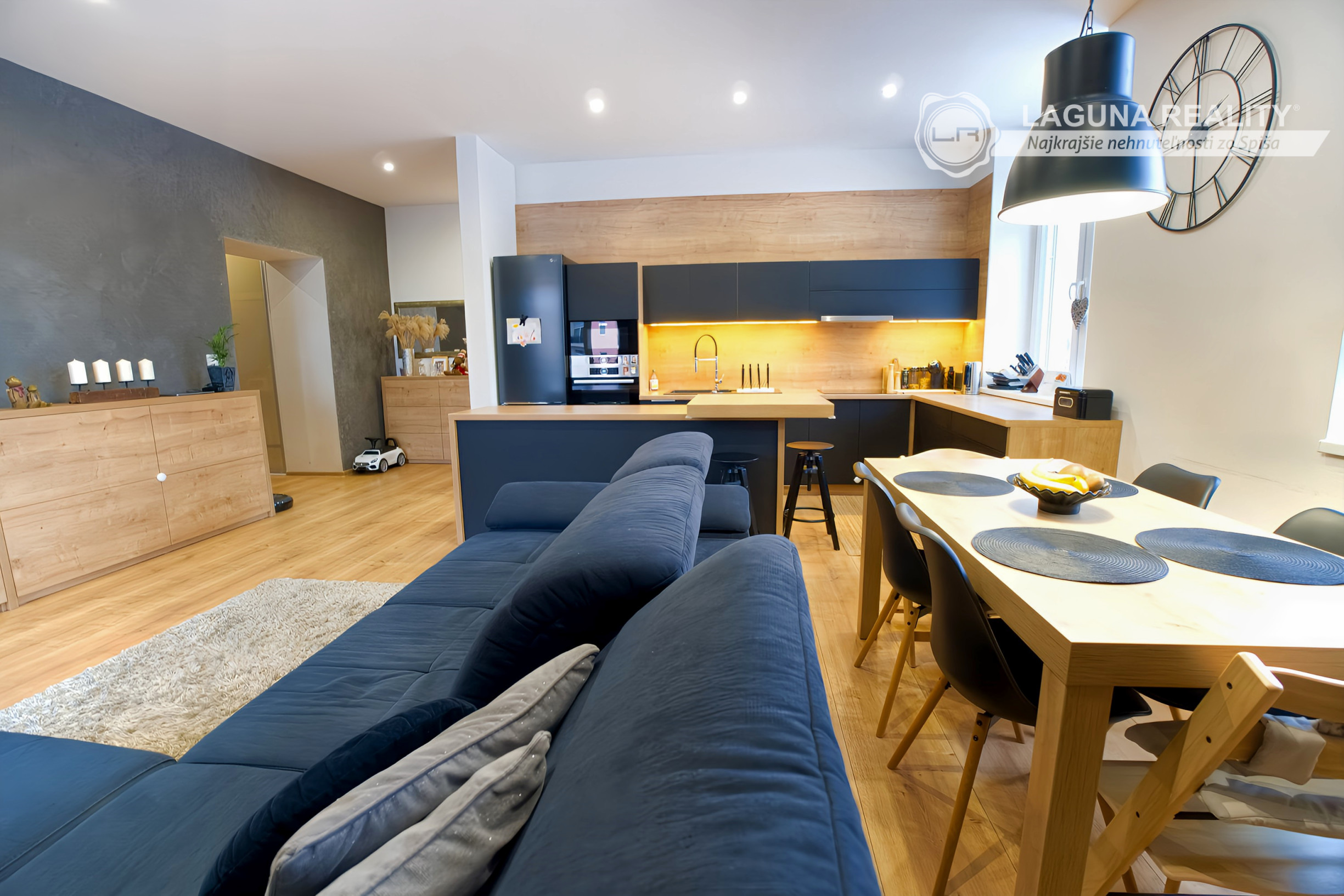 Celková výmera bytu je 84 m2 (bez plochy balkóna 8,8 m2). Pozostáva zo vstupnej chodby S VEĽKÝM ŠATNÍKOM a vstavanou skriňou, VEĽKEJ OBÝVACEJ MIESTNOSTI SPOJENEJ S KUCHYŇOU A VÝSTUPOM NA LOGGIU, SPÁLNE so vstavanou skriňou, DETSKEJ IZBY so vstavanou skriňou, KÚPEĽNE so sprchovacím kútom a SAMOSTATNÉHO WC. V byte sú kvalitné plavajúce podlahy, dvere s obložkami, bezpečnostné dvere, SHERLOCK, videovrátnik. Kuchyňa, riešená na mieru, je vybavená vstavanými spotrebičmi značky BOSCH, elektrická varná doska, digestor, el. rúra, mikrovlnná rúra, umývačka riadu, chladnička s mrazničkou.