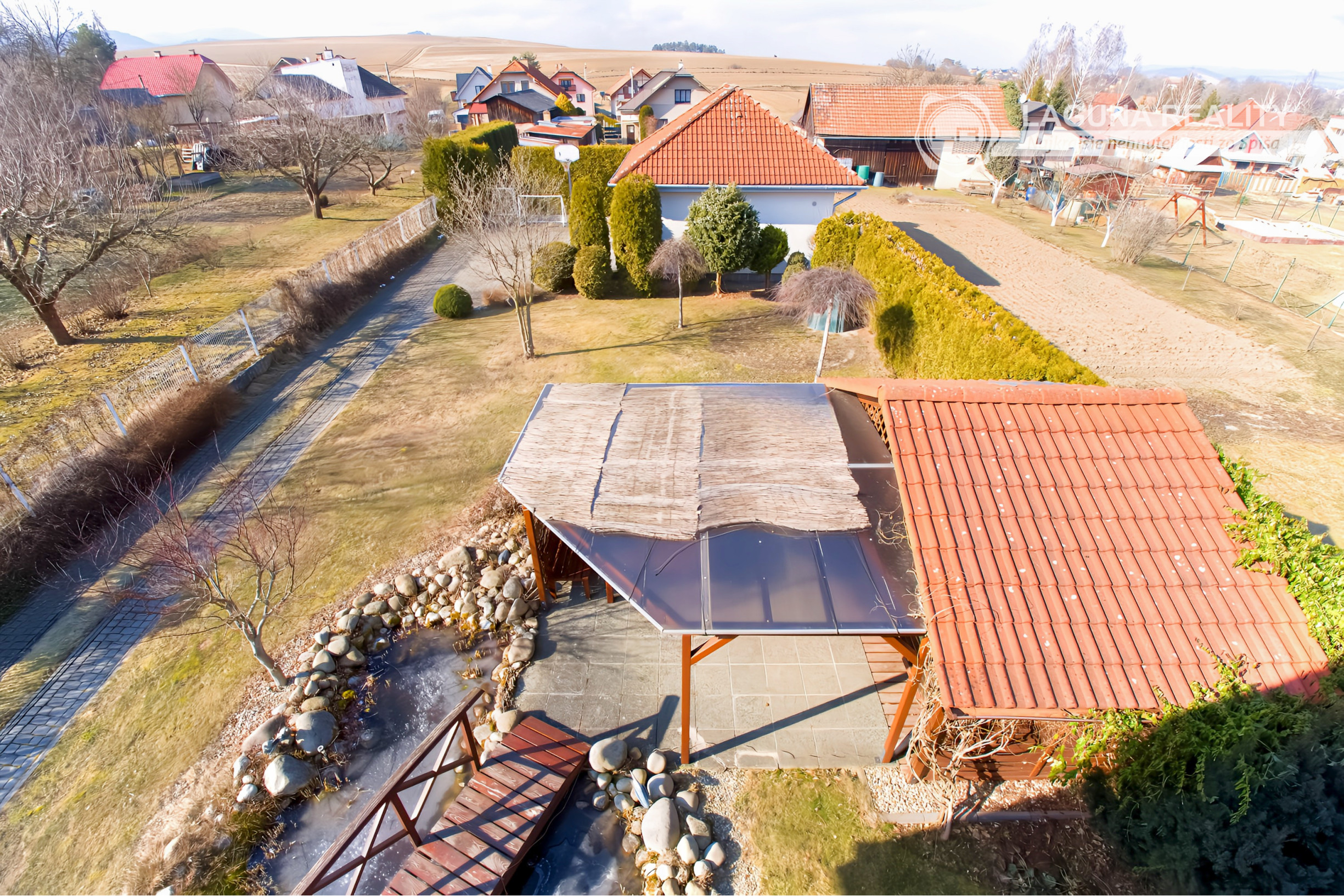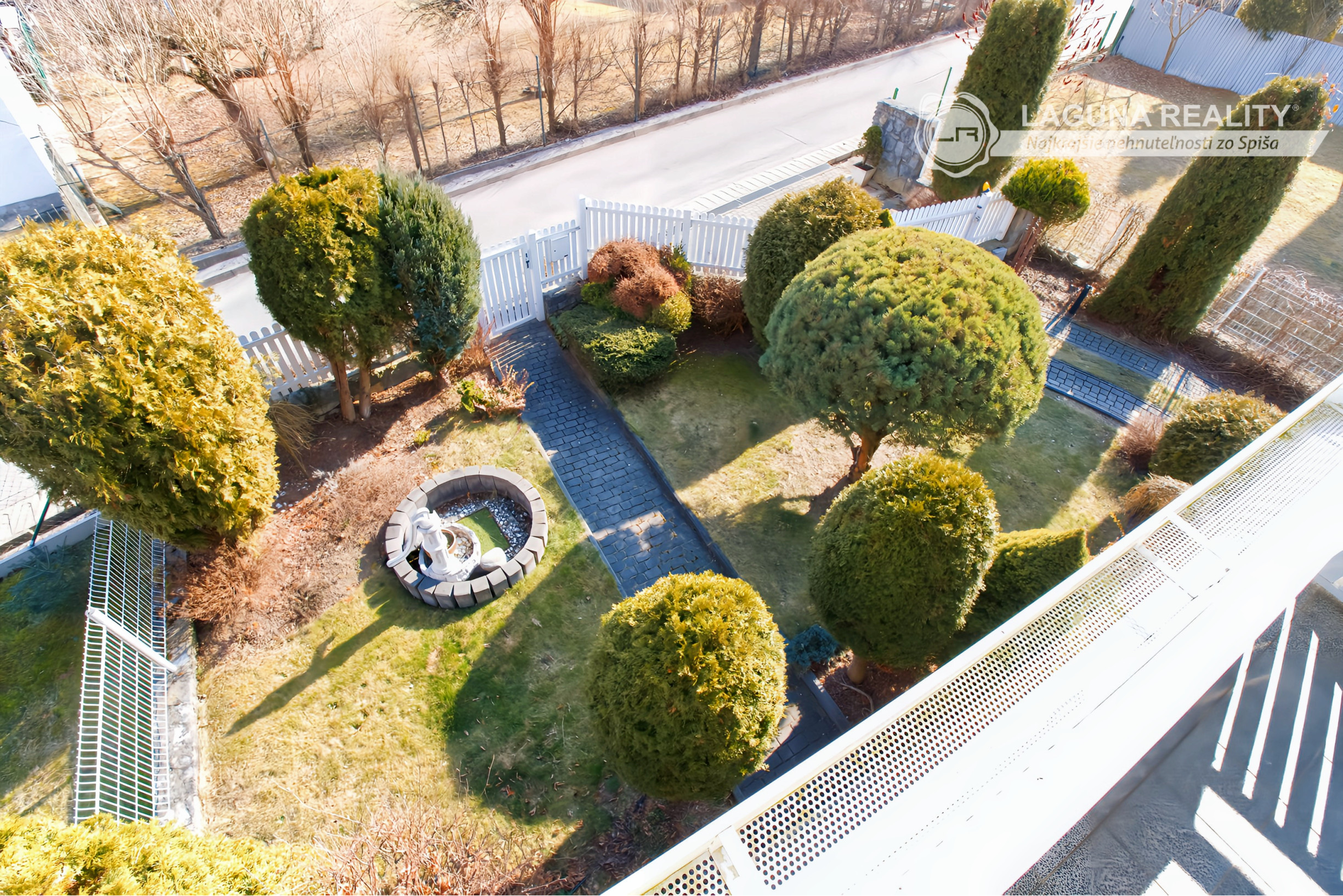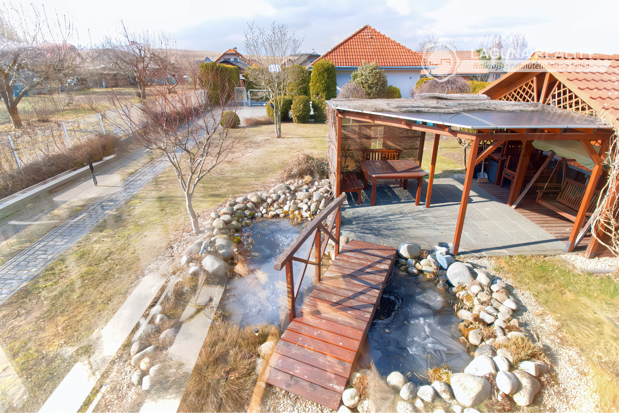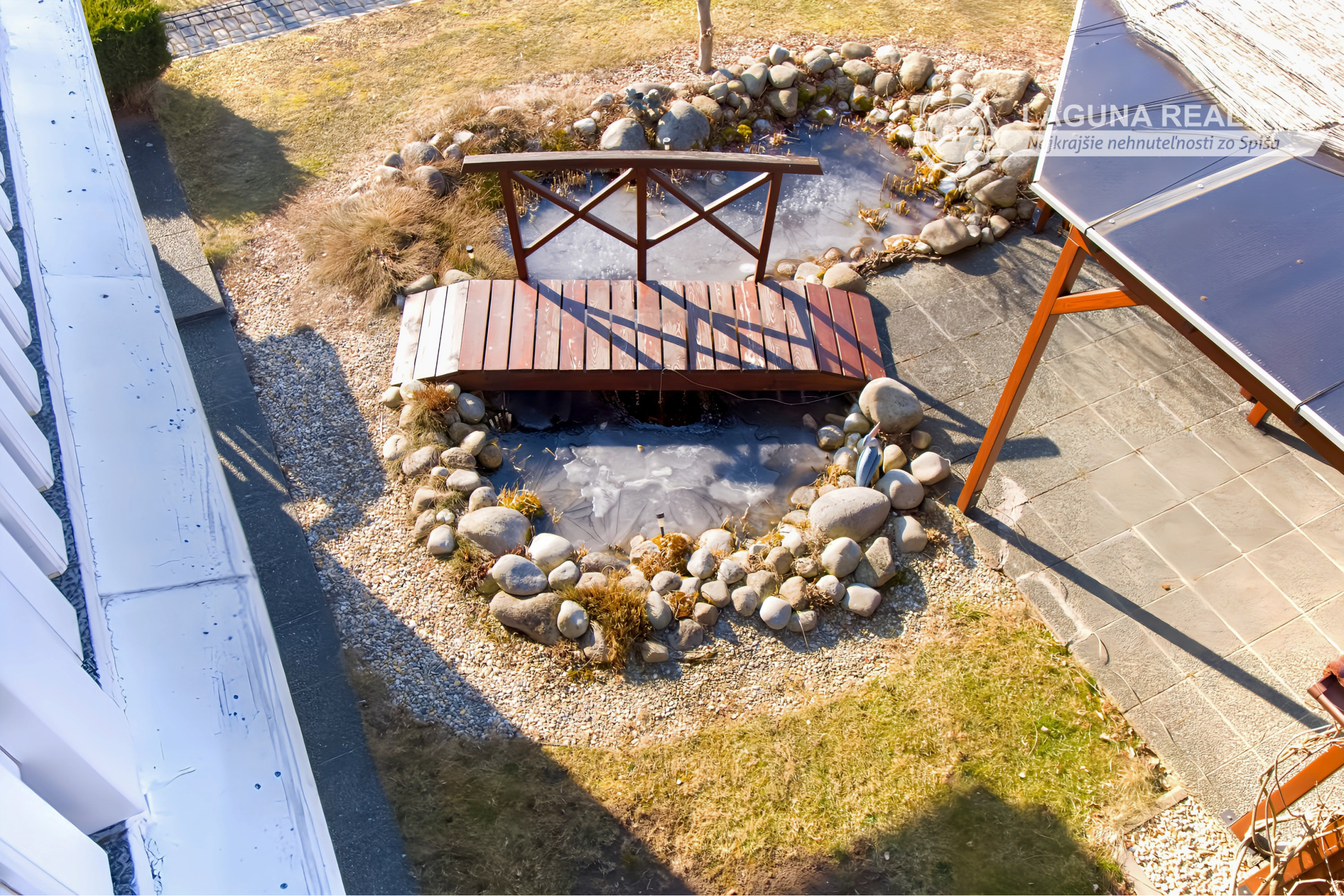 Veľkou prednosťou domu je VEĽMI PEKNE UPRAVENÝ A UDRŽIAVANÝ EXTERIÉR. Na celom pozemku je udržiavaný trávnik a osadené rôzne dreviny doplnené ďalšími prvkami záhradnej architektúry (chodníky, fontána, jazierko, lavička). VÝHODOU JE VONKAJŠIE ZASTREŠENÉ SEDENIE - ALTÁNOK s vonkajším krbom. V zadnej časti pozemku sa nachádza VELKÁ DVOJGARÁŽ so zastavanou plochou 48 m2.