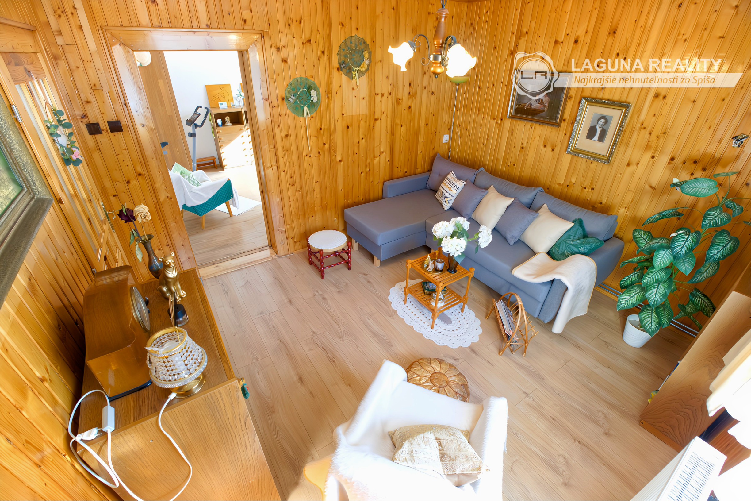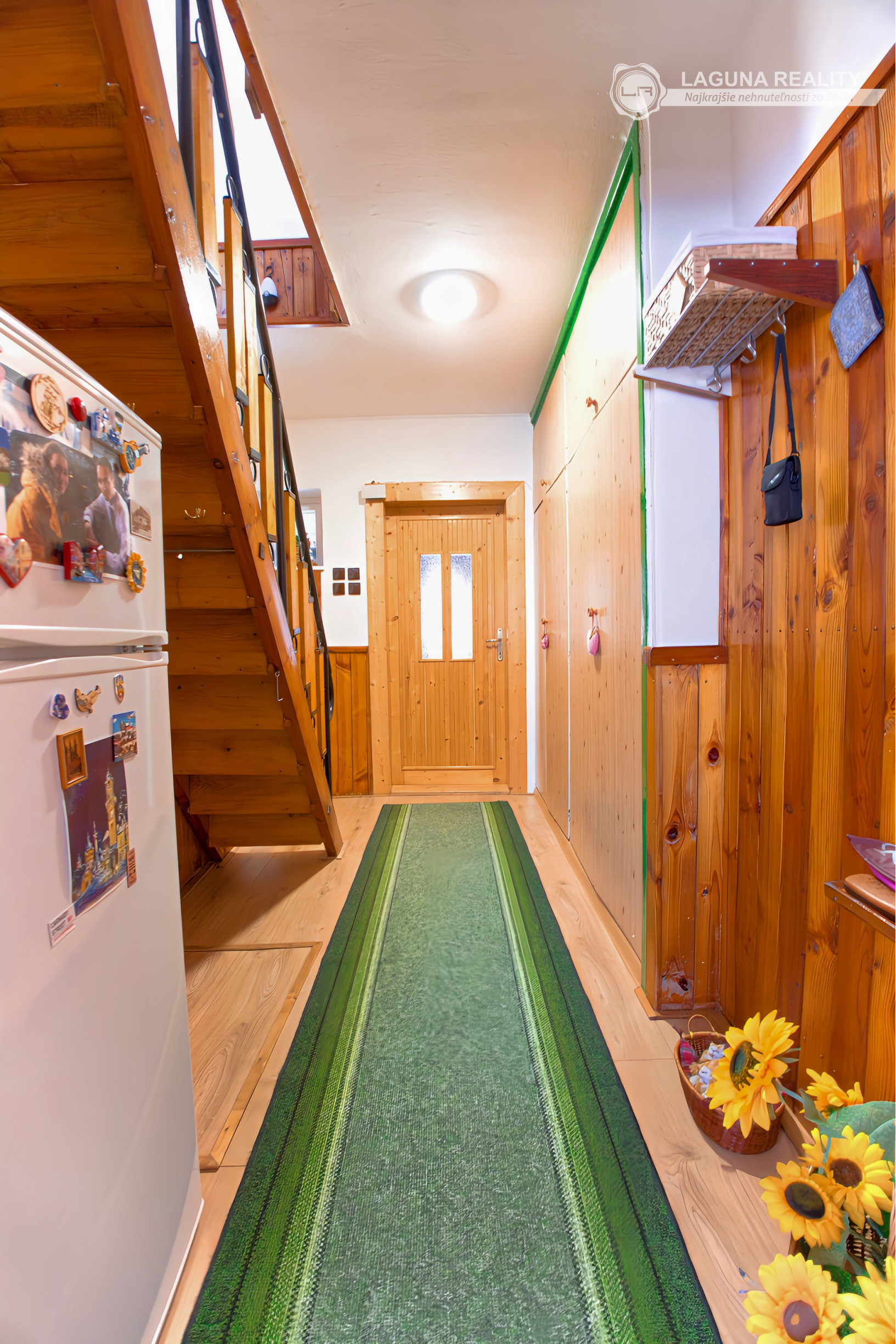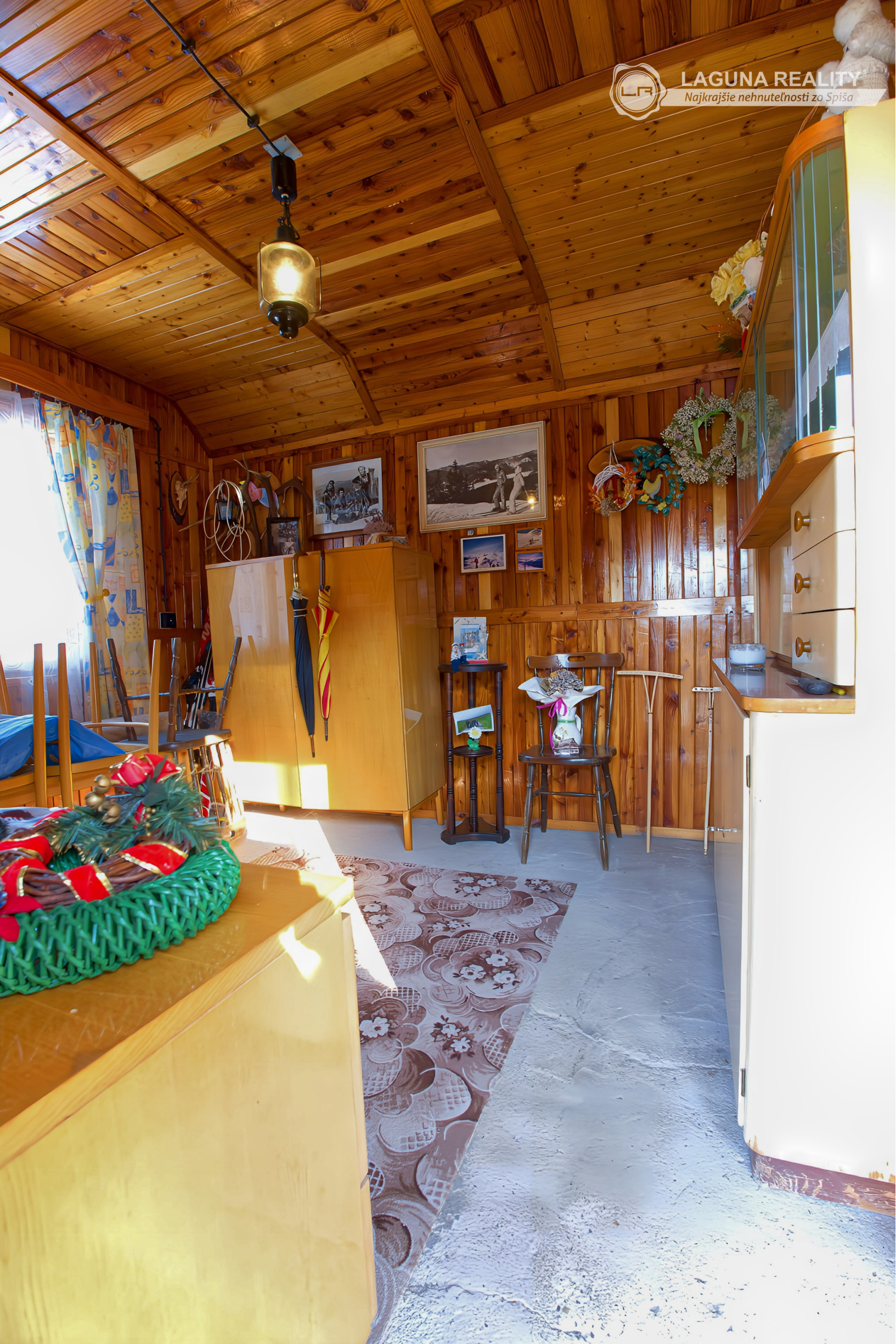 Pri vstupe do domu je PREDSIEŇ s uzavretým dostatočne veľkým odkladacím priestorom. Za predsieňou je CHODBA so vstavanou skriňou, schodiskom vedúcim do podkrovia, schodiskom do pivnice ako aj SAMOSTATNÉ WC. Z chodby sa ďalej vstupuje do KUCHYNE S JEDÁLENSKYM KÚTOM. Priestor je presvetlený, príjemnú atmosféru dotvára drevený obklad. V ľavej časti domu sa nachádzajú 2 obytné miestnosti - obývacia izba a spálňa. V pravej časti je KÚPELŇA SO SPRCHOVACÍM KÚTOM. V PODKROVÍ JE VEĽKÁ OBYTNÁ IZBA - využiteľná ako pohodlná presvetlenná SPÁLŇA S VÝHĽADOM NA LYŽIARSKY SVAH. Podlahová plocha domu je 92 m2 (bez plochy pivnice).