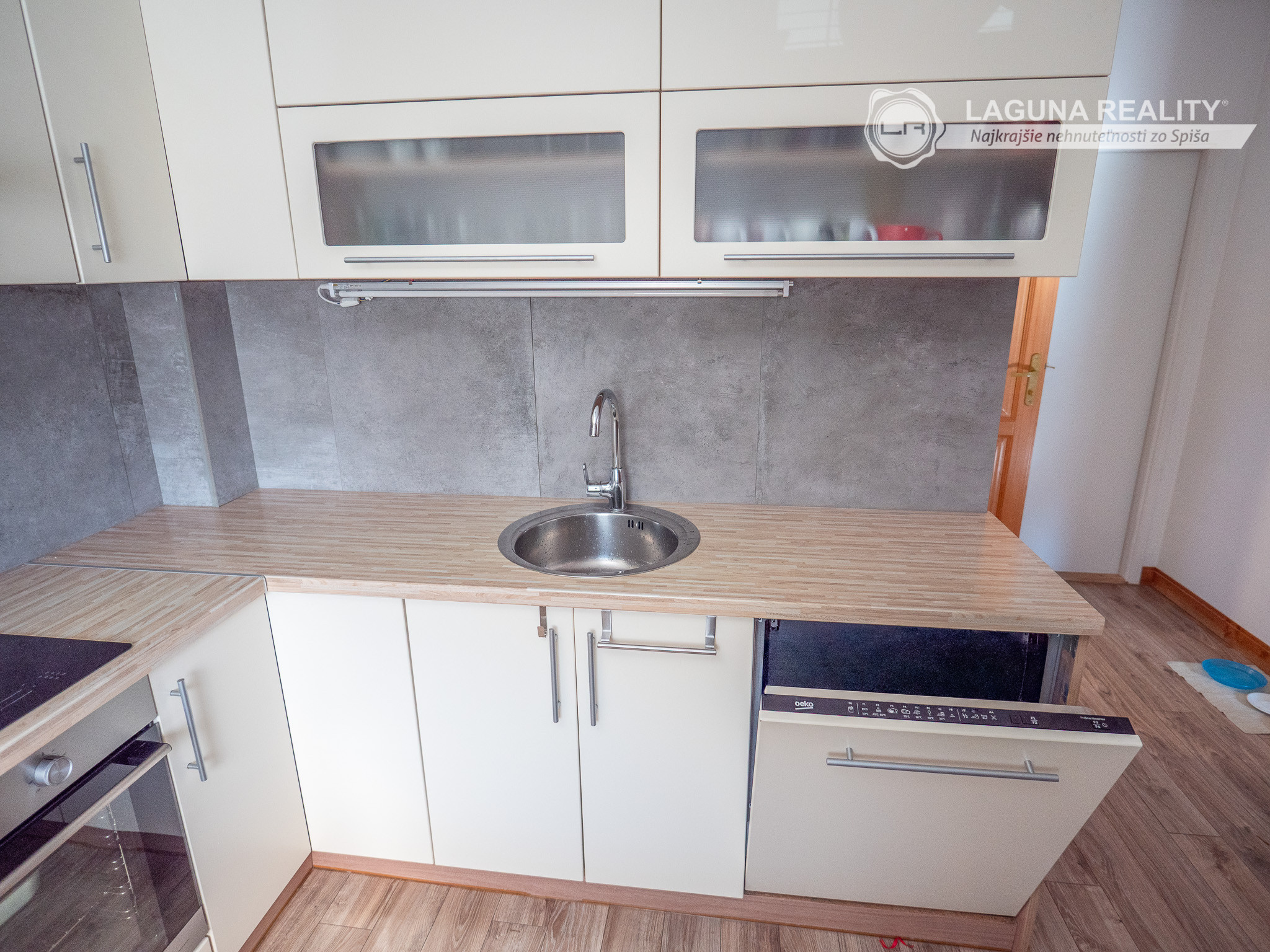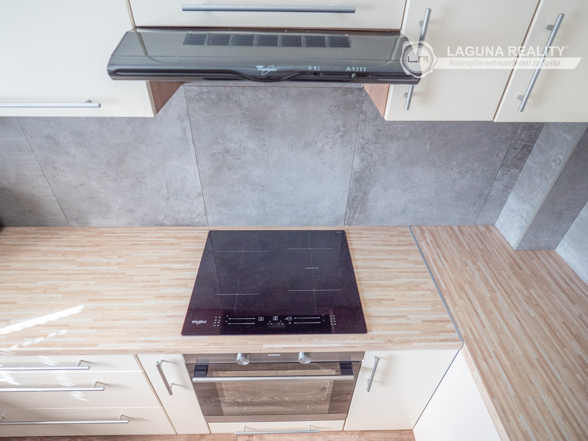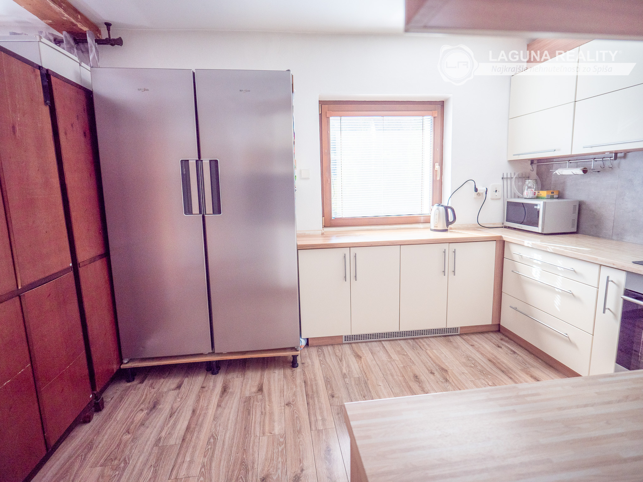 Moderná kuchyňa s keramickým sporákom, vstavanou rúrou, digestorom, veľkokapacitnou americkou chladničkou Whirlpool a myčkou.