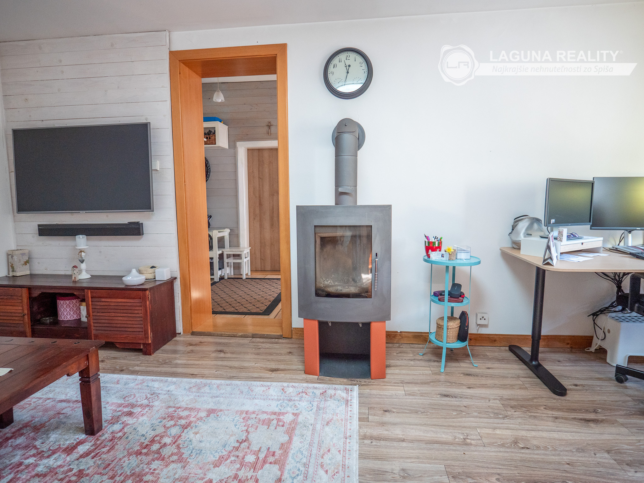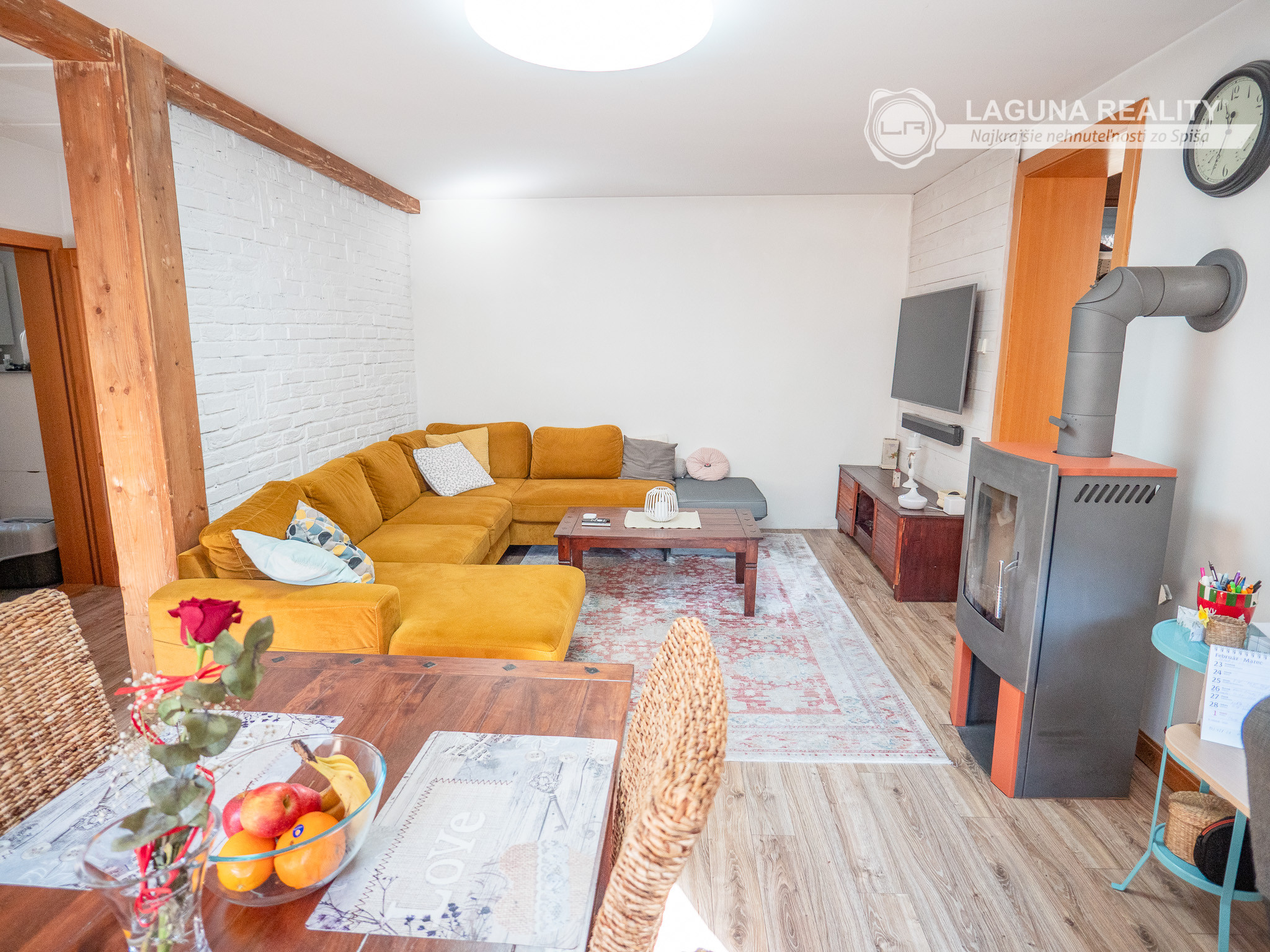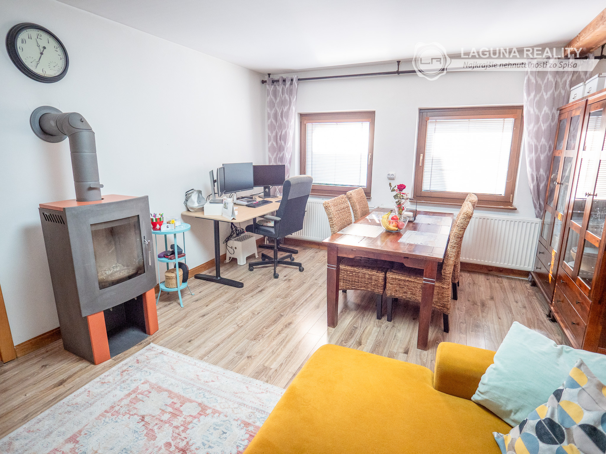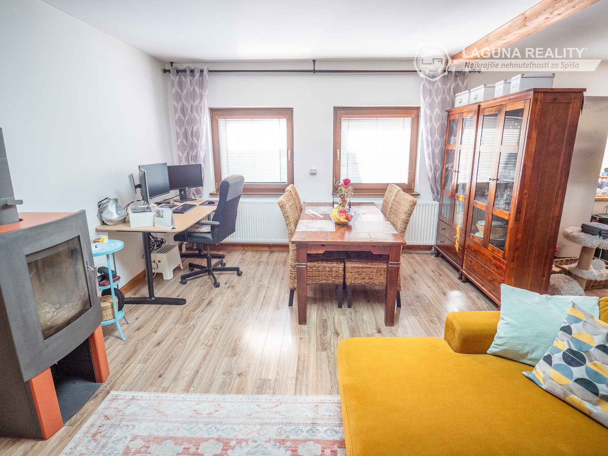 Priestranný obývací priestor s jedálňou ( i pracovným kúrikom) – srdce rodinného života s krbovou vložkou pre zimné večery ktorý dodáva domu neopakovateľný charakter a atmosféru.