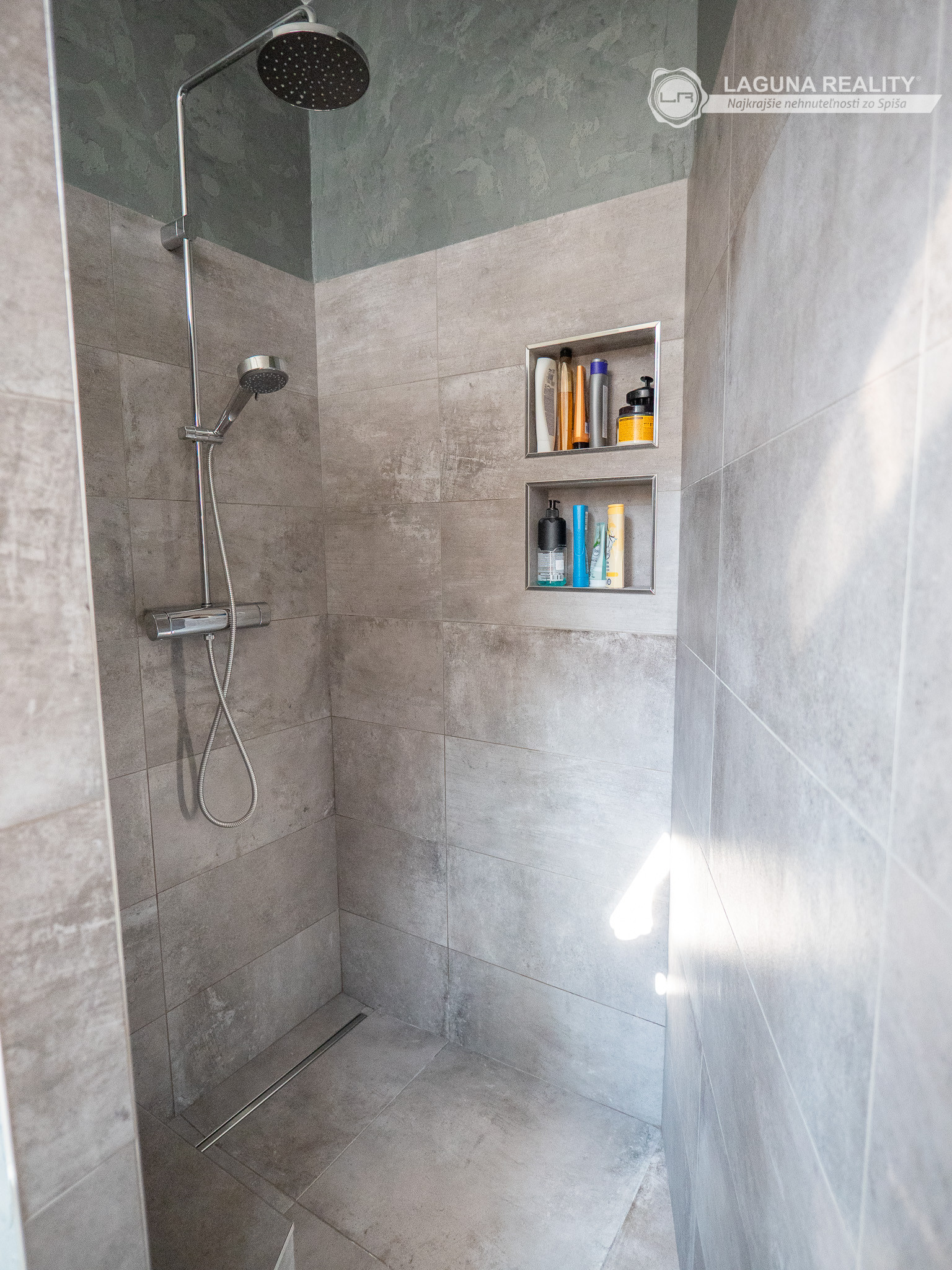 Luxusná kúpeľňa v sivom betónovom dekore s walk-in sprchou a dažďovou sprchou.