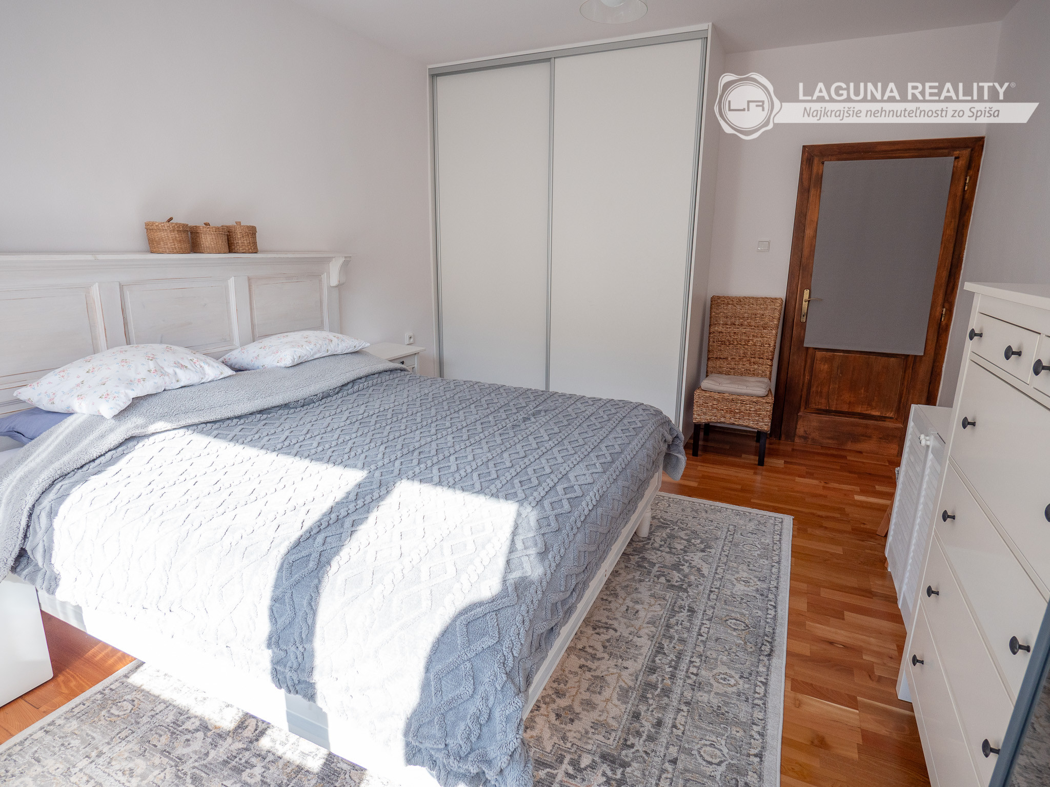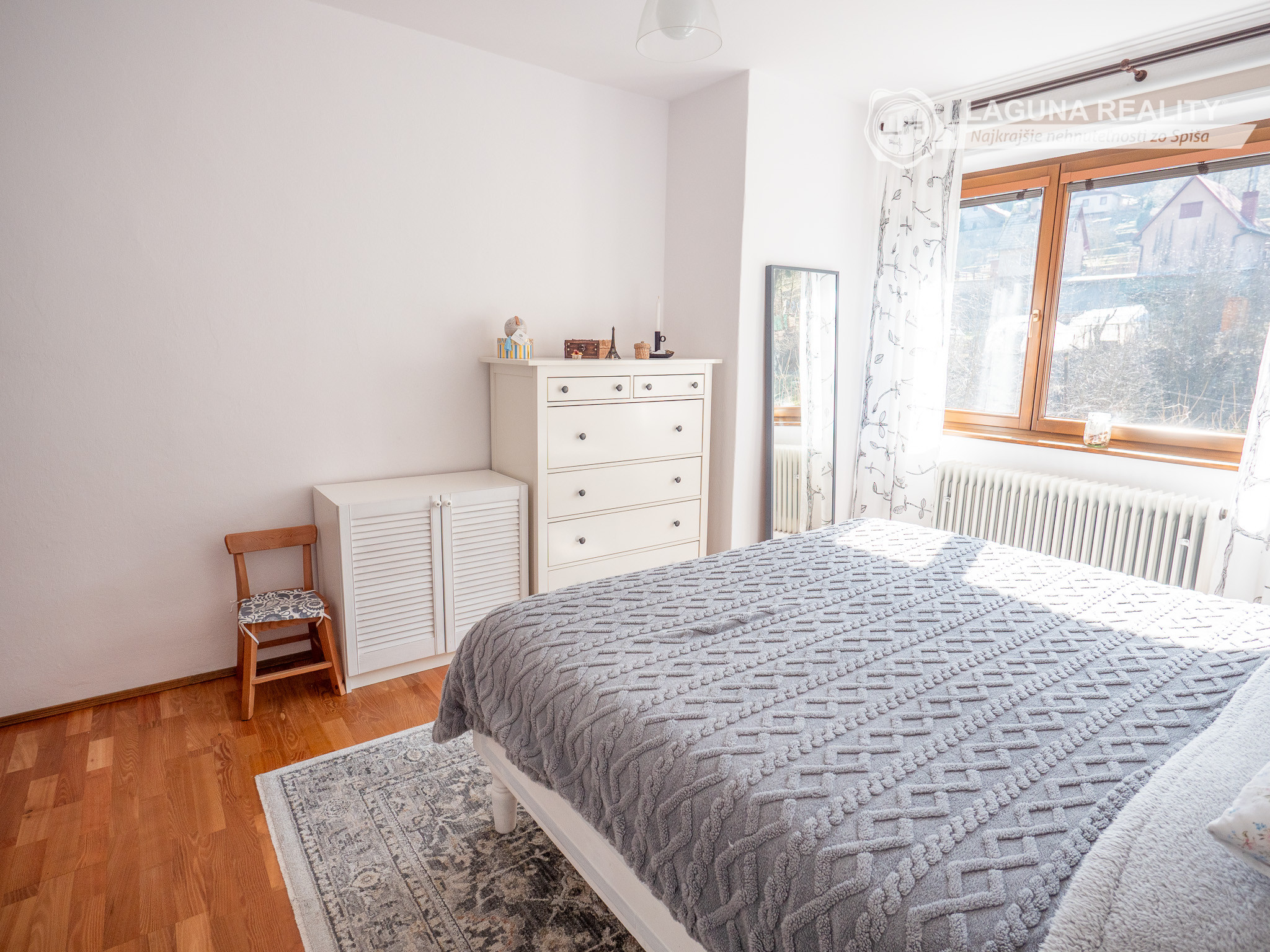 Vzdušná spálňa s bohatým prirodzeným svetlom a výhľadom na záhradky.