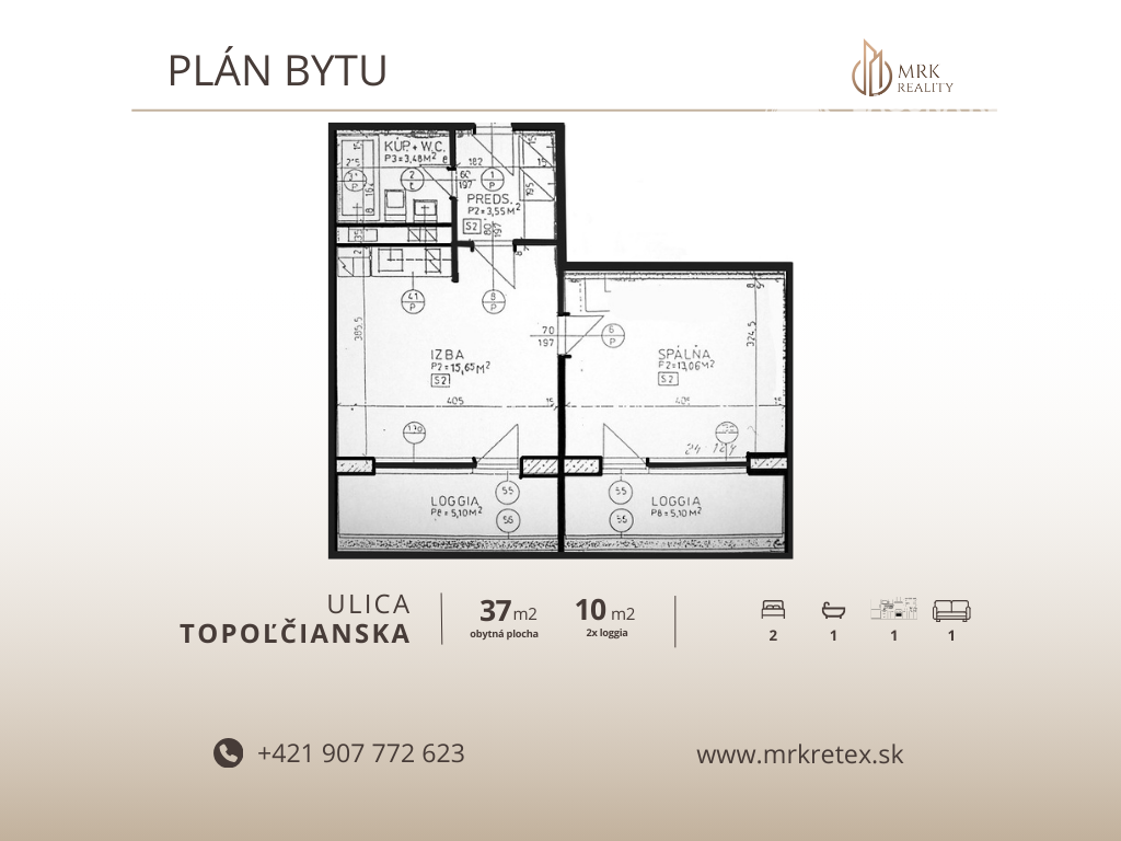 Dispozične byt pozostáva z obývacej izby spojenej s kuchynskou časťou, z priestrannej spálne, kúpeľne s WC a vstupnej chodby. Súčasťou bytu je loggia a pivničná kobka, ktoré poskytujú dostatok úložného priestoru.