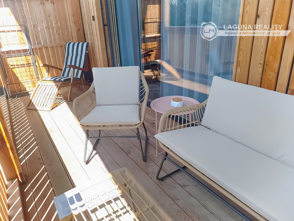 Apartmán sa nachádza v apartmánovom dome s celkovým počtom 4 dvojizbových apartmánov (2 sú umiestnené na prízemí a 2 apartmány na poschodí), každý má samostatný vstup. Riešený APARTMÁN SA NACHÁDZA NA POSCHODÍ, pričom veľkosť apartmánu je 48 m2 a veľkosť LOGGIE je 11 m2. Je KOMPLETNE ZARIADENÝ NÁBYTKOM A VYBAVENÍM (viď foto). Dispozične pozostáva z obývacej izby s VÝSTUPOM NA LOGGIU, a kuchynským kútom a jedálenským sedením, spálne, kúpeľne so spchovacím kútom. Vykurovanie v apartmáne je riešené ako podlahové elektrické. Výhodou je INTELIGENTNÁ ELEKTROINŠTALÁCIA s diaľkovým ovládaním vykurovania, apartmán je vybavený rekuperačnou jednotkou.Apartmánové domy majú moderný design z prírodných materiálov (kombinácia kameň, drevo). Výhodou je VEĽKÁ LOGGIA a JEDNO PARKOVACIE MIESTO. V rámci areálu je vytvorená oddychová zóna s detským ihriskom a preliezkami.