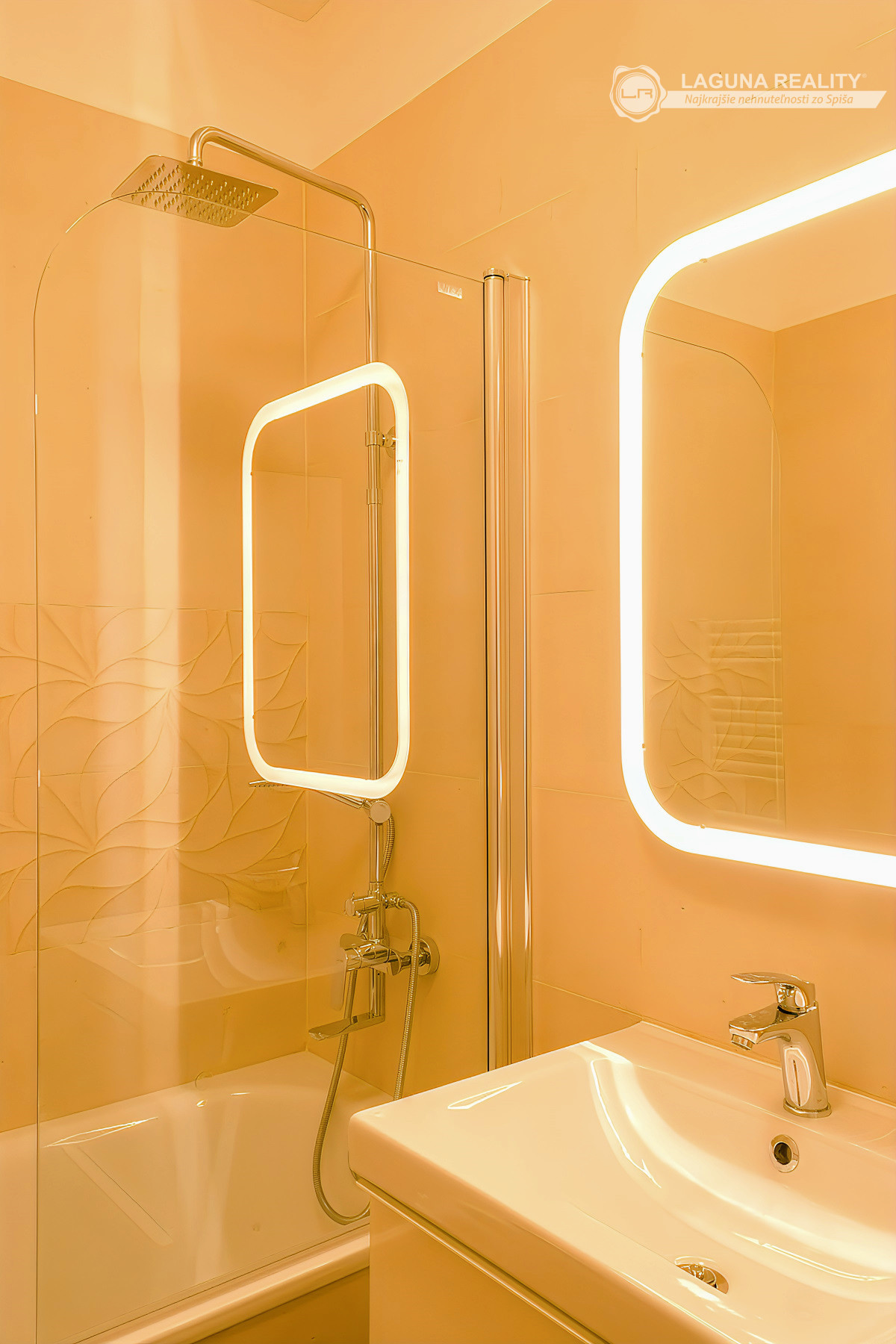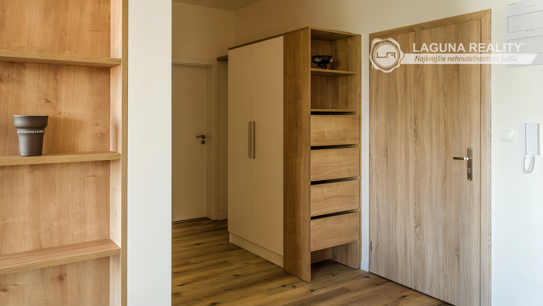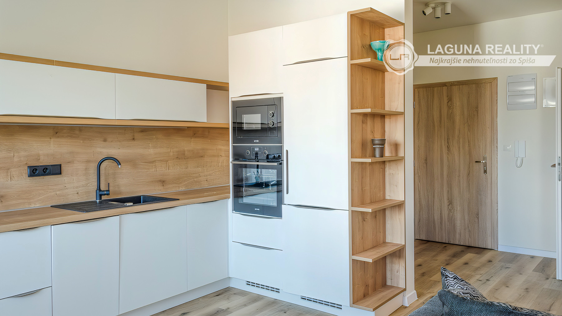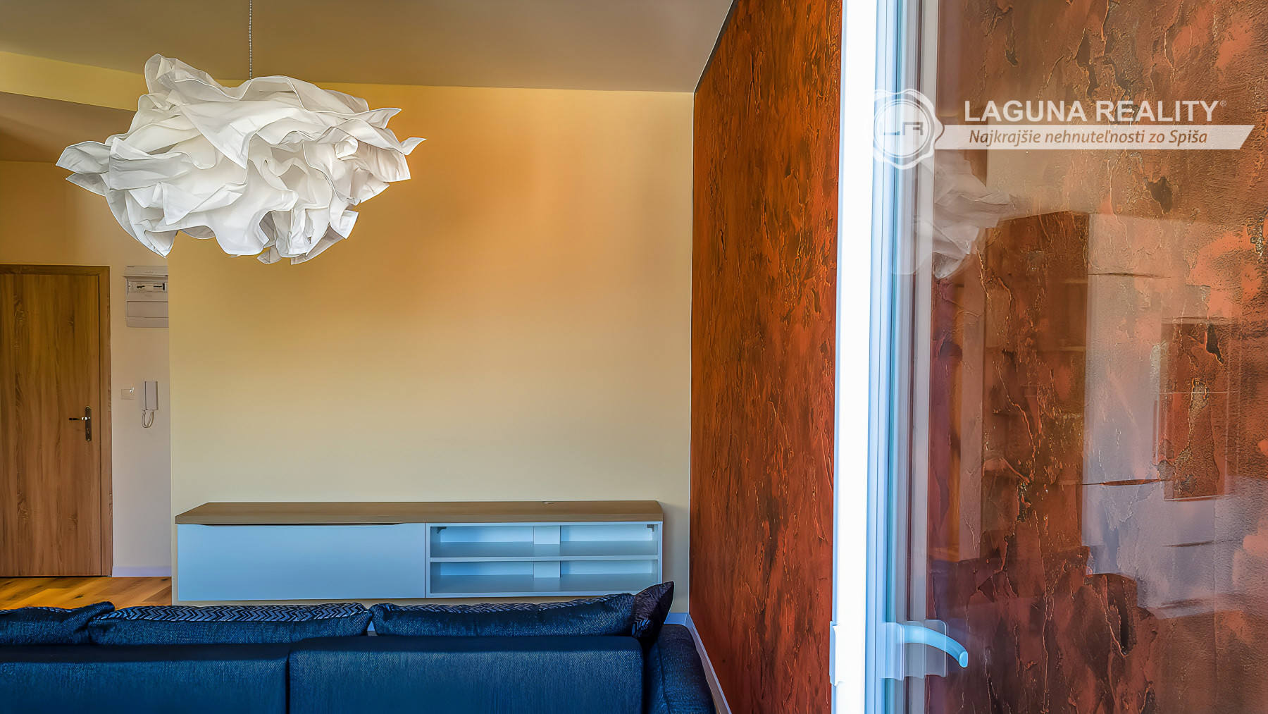 Pozostáva zo vstupnej chodby, obývacej miestnosti spojenej s kuchyňou, spálne, kúpeľne s vaňou a samostatného WC. Dominantou spojeného priestoru obývacej miestnosti a kuchyne je EXPRESÍVNA UMELECKÁ STENA v štýle all-at-wall. Z obývacej miestnosti vedie výstup na balkón s výhľadom na Vysoké Tatry. Kuchyňa riešená na mieru je vybavená vstavanými spotrebičmi - indukčná varná doska, digestor, el. rúra, mikrovlnka, chladnička s mrazničkou. V izbách je kvalitná vinylová podlaha, dlažba v kúpeľni a WC.